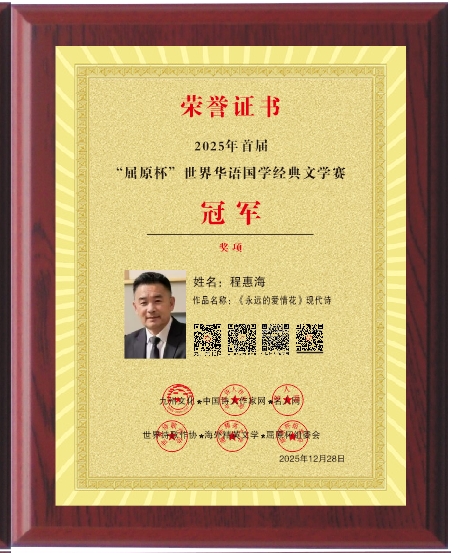 诗人简介:程惠海,字相儒,笔名,博文,男,1964年2月出生,中共党员,大学本科学历,山东省东明县人,教育家,书法艺术家,作家,诗人,高级心理咨询师,中国诗人作家网认证金笔诗人,中国诗人作家网编委会终身会员,中国书画家协会会员,被中国艺术家职称评定委员会评定为:一级书法师。曾任全国中等专业学校外语教学教研会理事,全国外语报社记者,美国海外艺术家协会理事,山东省师范教育学会理事,山西省《学习报》特邀编辑,知程书画院院长。独著和任主编、副主编出版的著作有《初级英语学习指导》、《中华教育与教学实践》、《教育教学研究》、《中学生思想品德修养》、《儿童心理与教育法》。1997年6月被国际文化出版公司特聘为《全国中小学优秀教改经验论文集》编委,连续出版五卷,达800多万字。在各报刊发表论文有:《浅析英汉两种语言的异同》、《浅谈中专英语语法总复习》、《论外语教学研究与实践》、《加强师资队伍建设,促进素质教育发展》等20余篇。在2022年翰墨百“神州韵律杯”全国原创诗词大赛中,作品荣获优秀奖。在《中国诗人辞典》暨第五届“孔子诗歌杯”全球诗人作家创作大奖赛获新锐诗人奖。在各大网站诗词刊物发表的代表作品有:《春天》、《心境》、《悟道》、《感言》、《知足常乐》、《岁月虽老.心向暖阳》、《永远的爱情花》等300多首。其卓越成就已被收入《中国当代知名学者辞典》、《中国当代著作家大辞典》、《世界名人录》、《华夏诗词》、《华夏诗歌》、《中国诗人辞典》等。在2024年度“中华诗.金蝉奖”中,荣获特别优秀诗人奖。在2025 年全球华语文豪之巅“中华星光杯”文化传承文学赛中,荣获季军。在2025年首届“屈原杯”世界华语国学经典文学赛中,荣获冠军。
