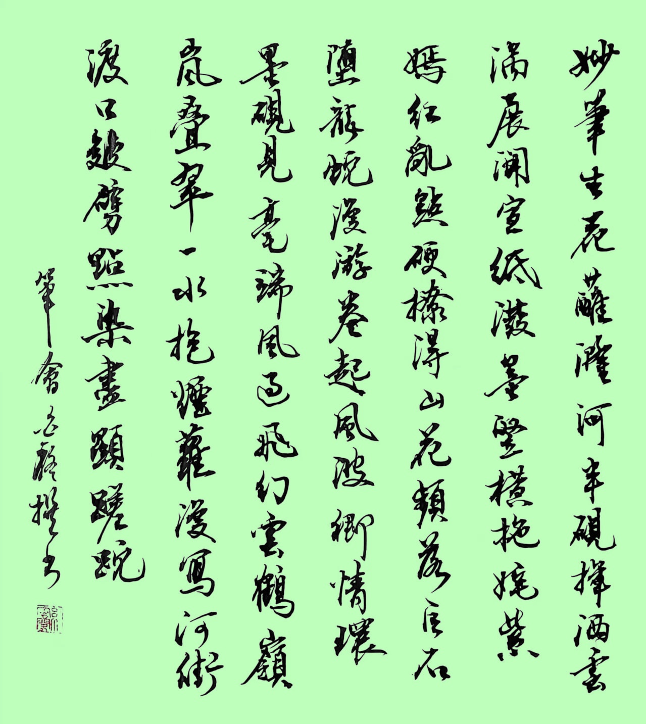 妙笔生花,蘸、漋河半砚,挥洒云涡。展开宣纸,泼墨竖横拖,姹紫嫣红乱点,硬撩得、山花频落。巨石坠,龙蛇漫游,卷起风波。(幺)乡情环萦墨砚,见、毫端风起,飞幻云鹤。岭岚叠翠,一水抱烟萝。漫写河街渡口,染清韵、千帆穿梭。墨浪落,皴劈点染,尽入吟哦。