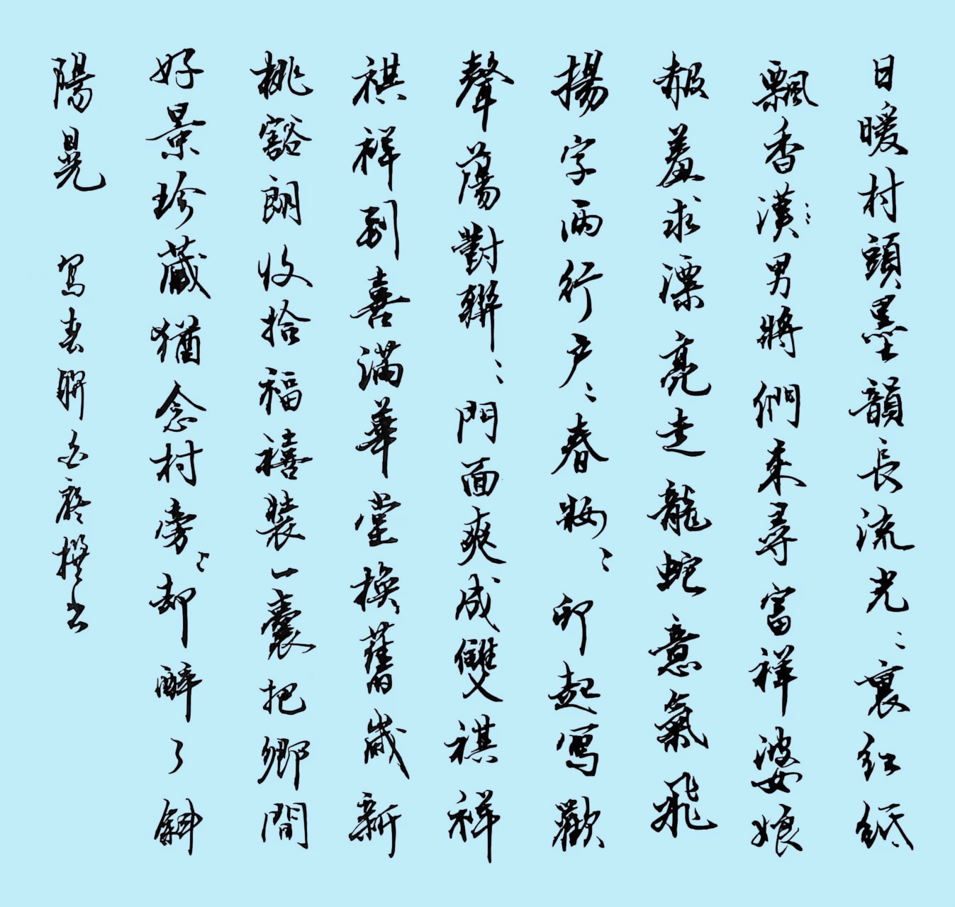日暖村头墨韵长,流光,流光里、红纸飘香。男将们、来寻富祥,婆娘赧羞求漂亮。走龙蛇、意气飞扬,字两行,户户春妆,户户春妆,卯起写、欢声荡。(幺)对联对联门面爽,成双,祺祥。祺祥到、福满华堂。换旧岁、新桃豁朗,收拾喜乐装一囊,把乡间、好景珍藏。犹念村旁,犹念村旁,却醉了斜阳晃。