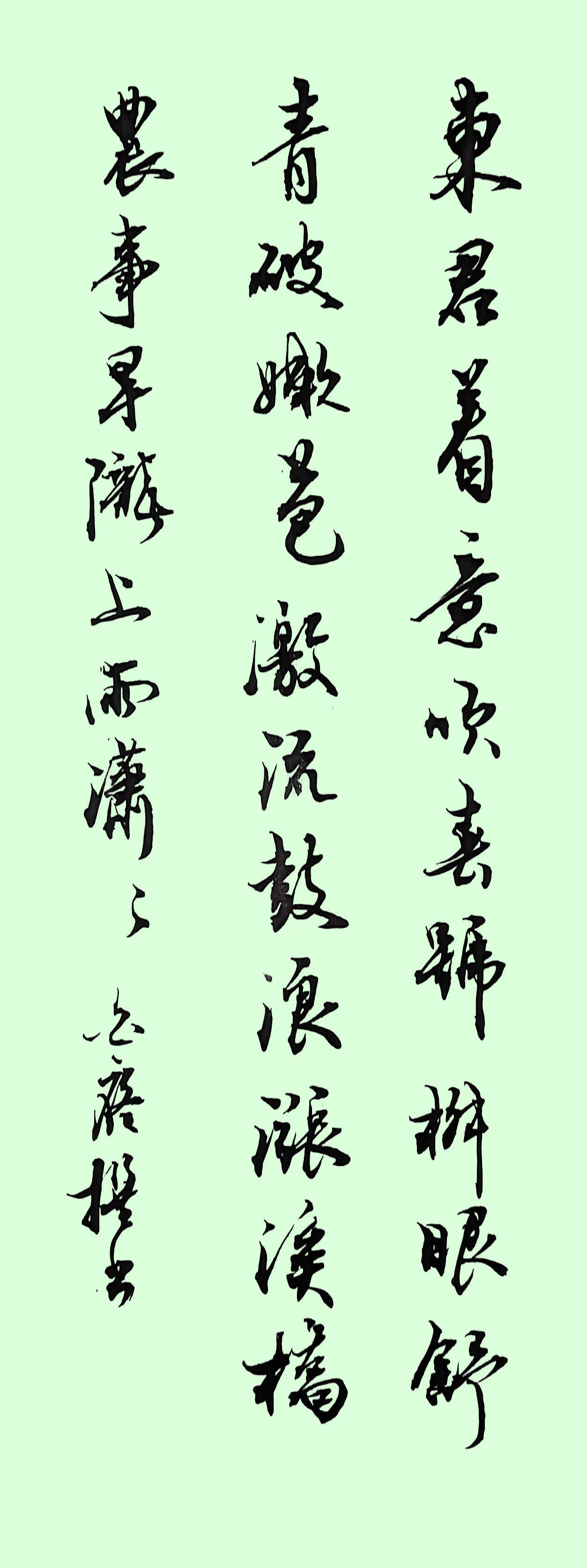 东君着意吹春号,柳眼舒青破嫩苞,激流鼓浪涨溪桥。农事早,陇上雨潇潇。