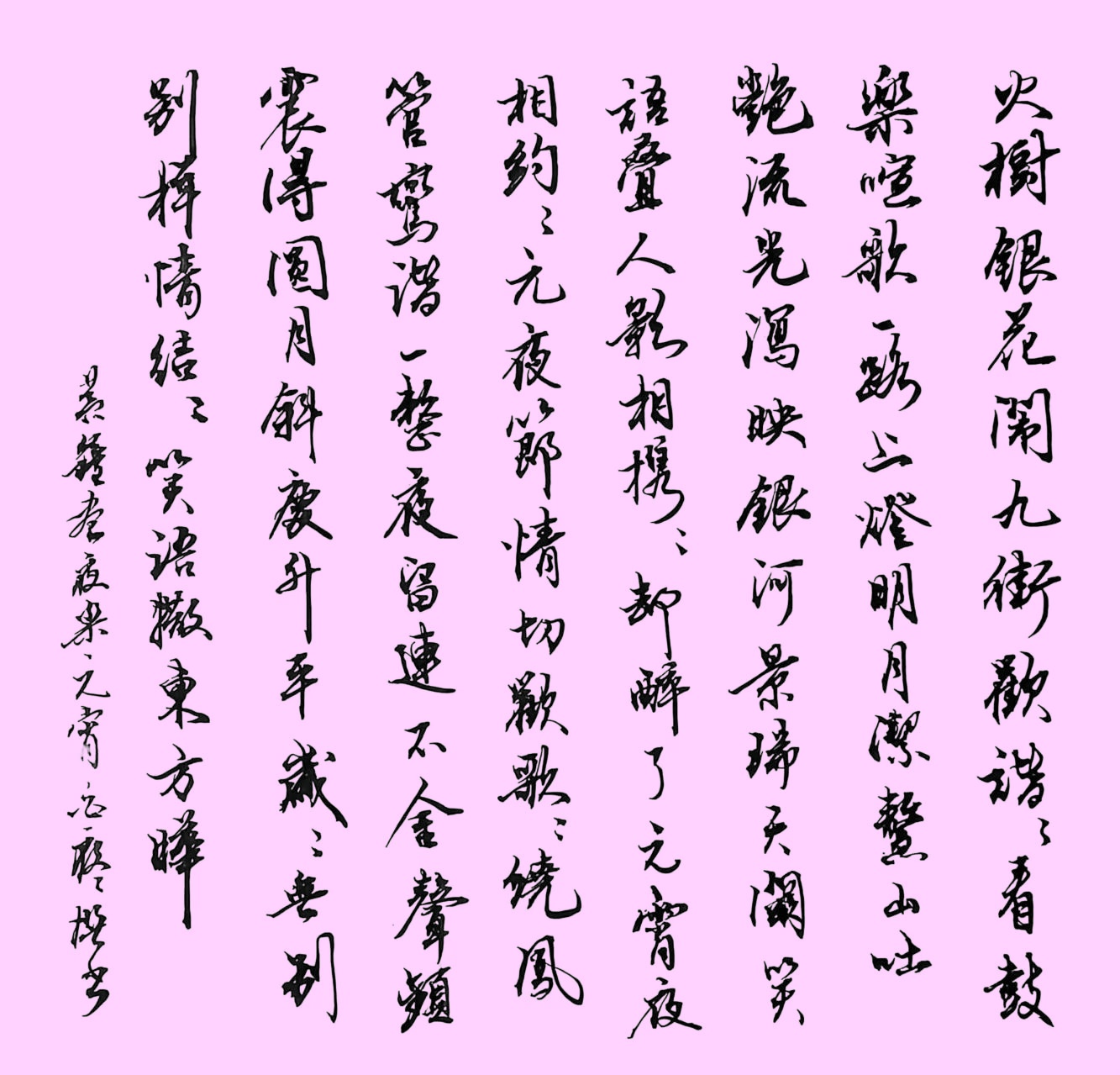 火树银花闹九街,欢谐,欢谐看、鼓乐喧歌。一路上、灯明月洁,鳌山吐艳流光泻。映银河、景瑞天阙。笑语叠,人影相携,人影相携,却醉了、元宵夜。[幺篇]相约,相约元夜节,情切,欢歌,欢歌绕、凤管鸾谐。一整夜、流连不舍,声频震得圆月斜。庆升平、岁岁无别。别样情结,别样情结,笑语撒、东方晔。
