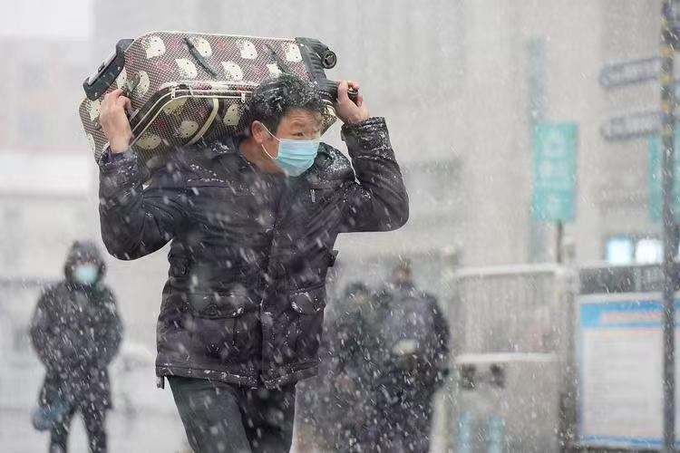雨雪纷飞冻客凶,大包行李压眉容。