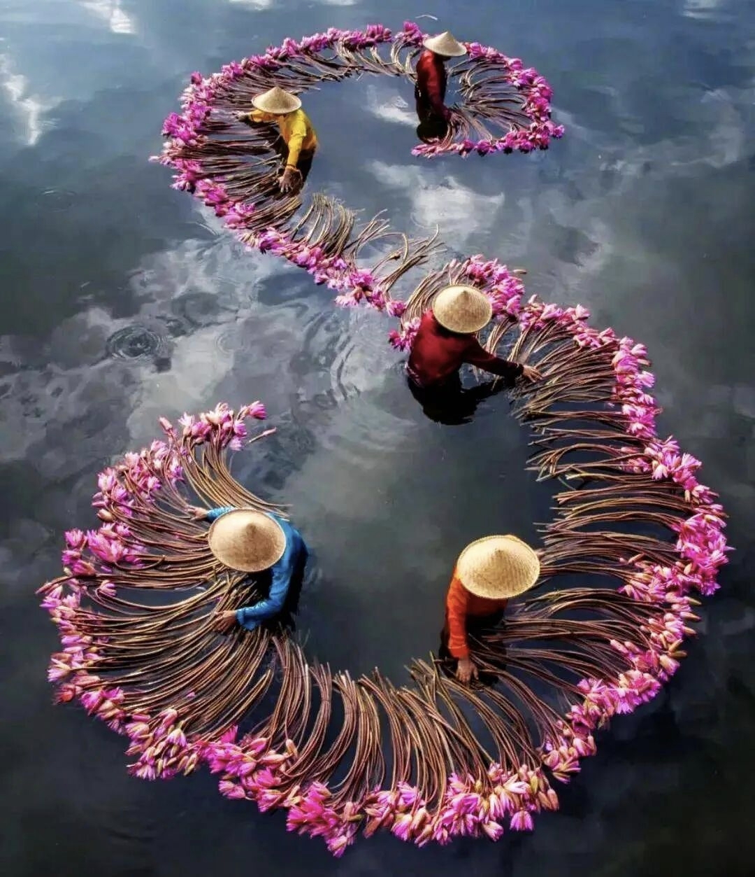(注:本诗通过四十联场景转换展现女工采睡莲的全过程。诗中“分绡素手”“照影罗衣”等句聚焦劳动细节,“岂学夭桃”“羞随岸柳”深化物性品格,尾联以西施舫作对比,暗示当代劳动女性之美。全篇以莲喻人,将传统意象与现代女工精神交融。)