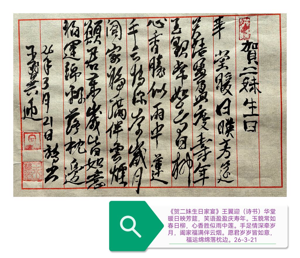 【注】上句赞其貌美逢春,下句叙亲情同饮,用“千秋福”与“百岁欢”寄寓长寿顺遂。