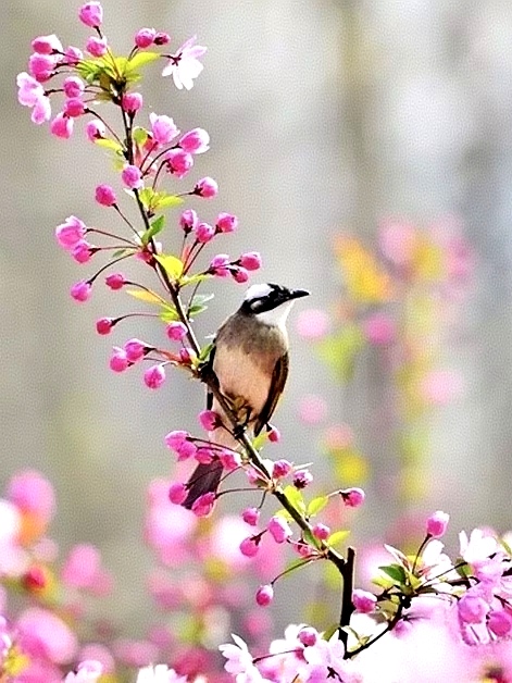 春回大地暖风中,小鸟翩跹戏嫩红。