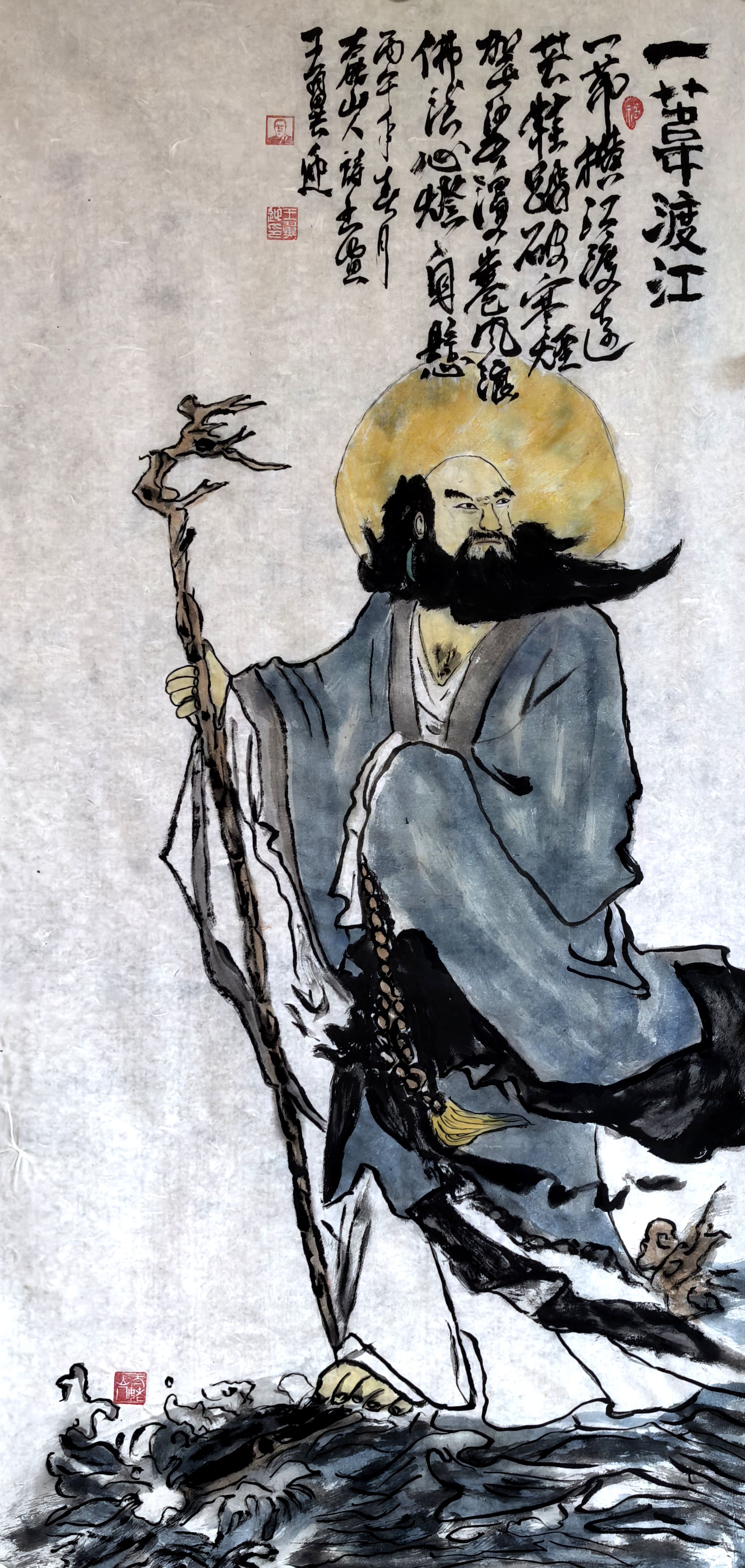 注释:◎一苇横江:化用达摩祖师一苇渡江典故,以芦苇为舟,横渡长江,尽显禅者洒脱与佛法弘传之志。◎袈裟猎猎:写江风鼓荡,衣袂飞扬,勾勒出高僧不畏风浪的风骨。◎心灯自照:以心为灯,喻佛法智慧能破除迷茫,照亮修行之路。◎ 菩提树下:指达摩祖师后来在嵩山少林寺面壁九年,终成禅宗初祖,点明修行归宿。