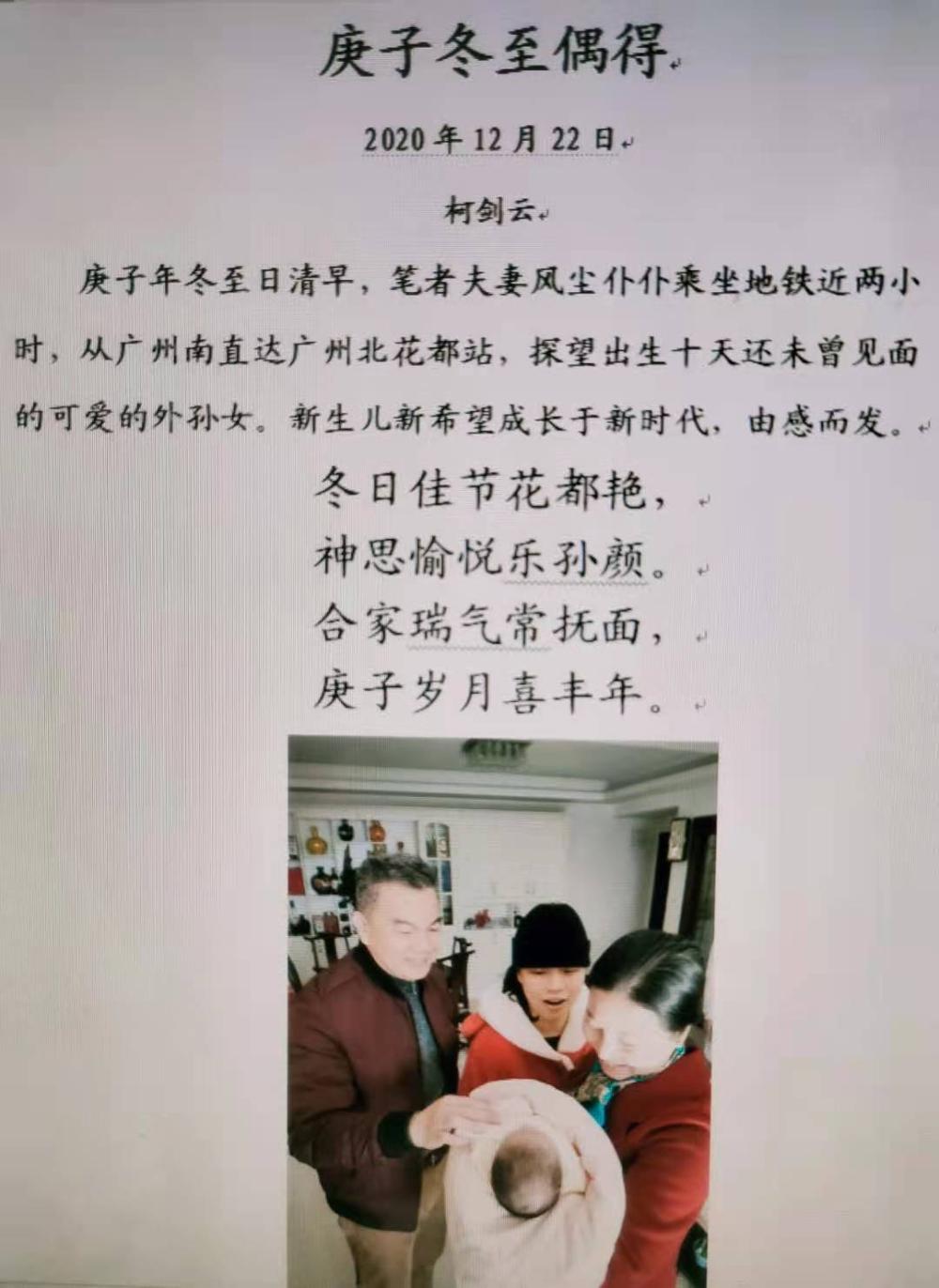 2020年12月22日庚子年冬至日清早,笔者夫妻风尘仆仆乘坐地铁近两个小时,从广州南直达广州北花都站,探望出生十天还未曾见面的可爱的外孙女。新生儿新希望成长于新时代,有感而发。 2020年12月22日庚子年冬至日清早,亲家夫妻风尘仆仆乘坐地铁近两个小时,从广州南直达广州北花都站,探望出生十天还未曾见面的可爱的外孙女。新生儿新希望成长于新时代,有感而发。 版