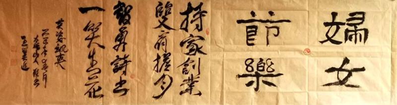 《三八節感序》 文/中元沉魚落雁永嬋聯,女傑豪情賽麗娟。孝敬公婆三頓奉,恩施教子相夫賢。能乘母艦巡疆海,可駕神舟探碧天。拙婦緘言專誌事,祥風急雨潤文淵。
