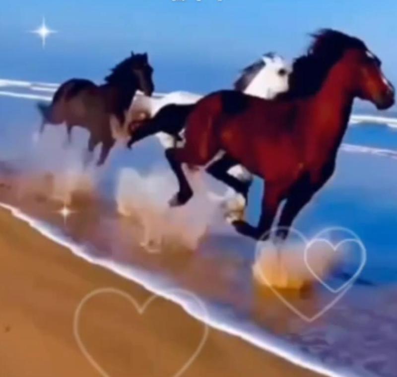 蔚蓝的太空中出献一道晚霞马在芦伟中饮水戏闹中的战马启波浪国有养马之骏,人人赞