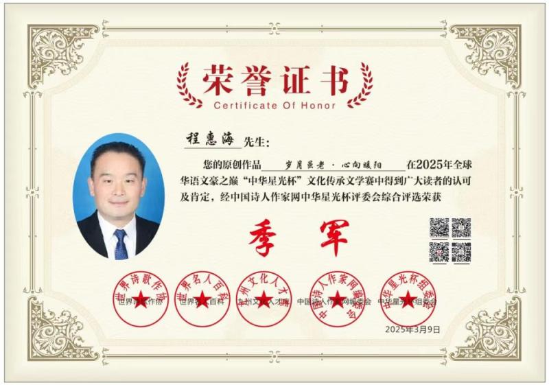 夏安 程惠海(菏泽)蝉鸣树影三伏长,蒲扇轻摇竹席凉。心静自有清泉涌,知足常伴荷风香。善念如丝织好运,宽容恰似晚风畅。且看流星划苍穹,安然一夏好时光。