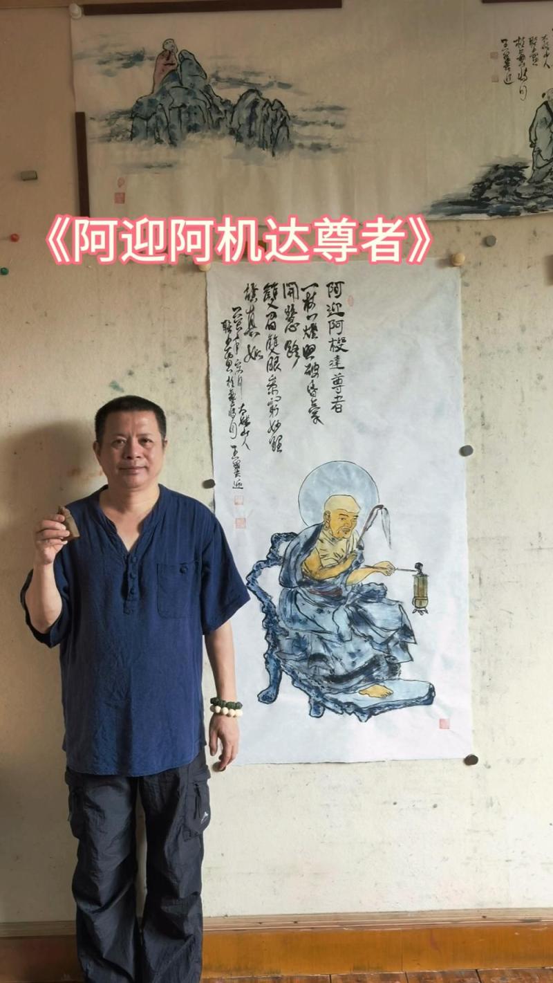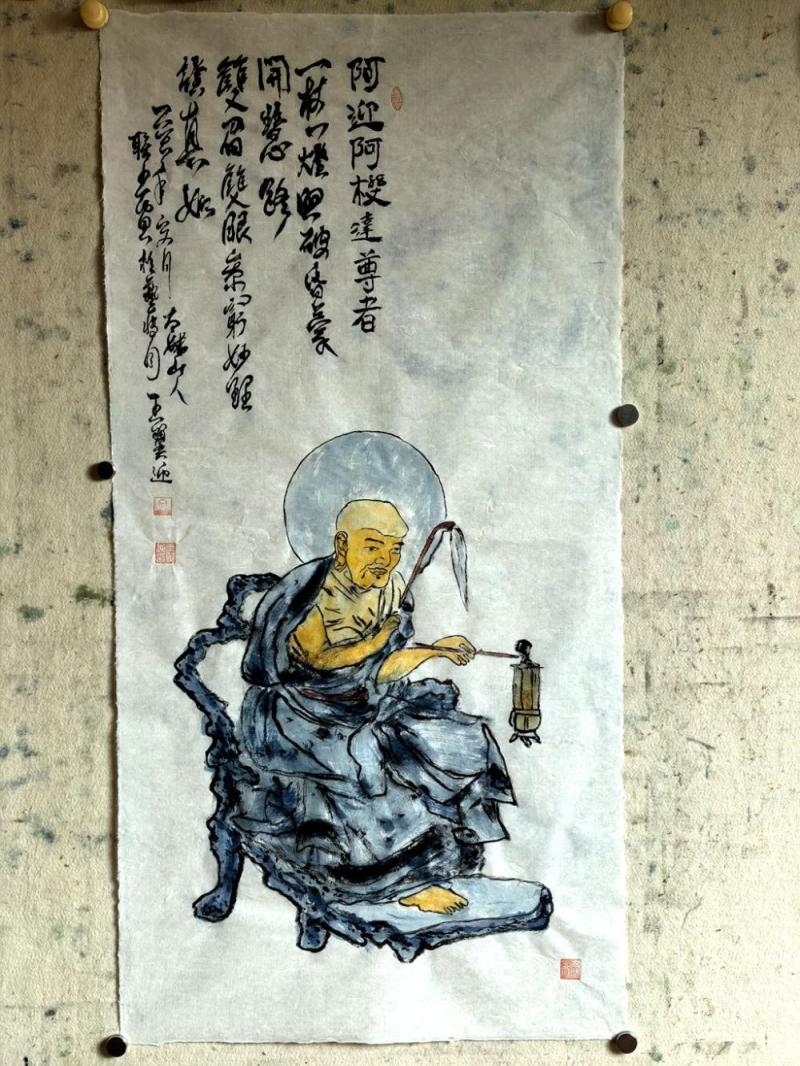 古卷展来瞻圣相,禅姿静对青山。袈裟轻覆忘尘烦。蒲团凝岁月,心寄白云端。悟得真如超物外,清风常伴清欢。愿随尊者探幽玄。俗缘皆放下,妙意满心传。
