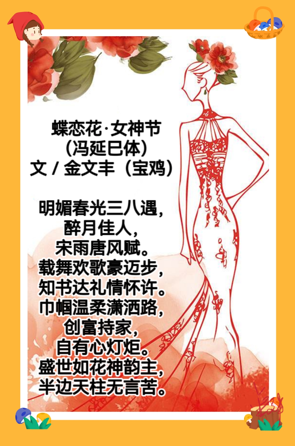 明媚春光三八遇,醉月佳人,宋雨唐风赋。载舞欢歌豪迈步,知书达礼情怀许。