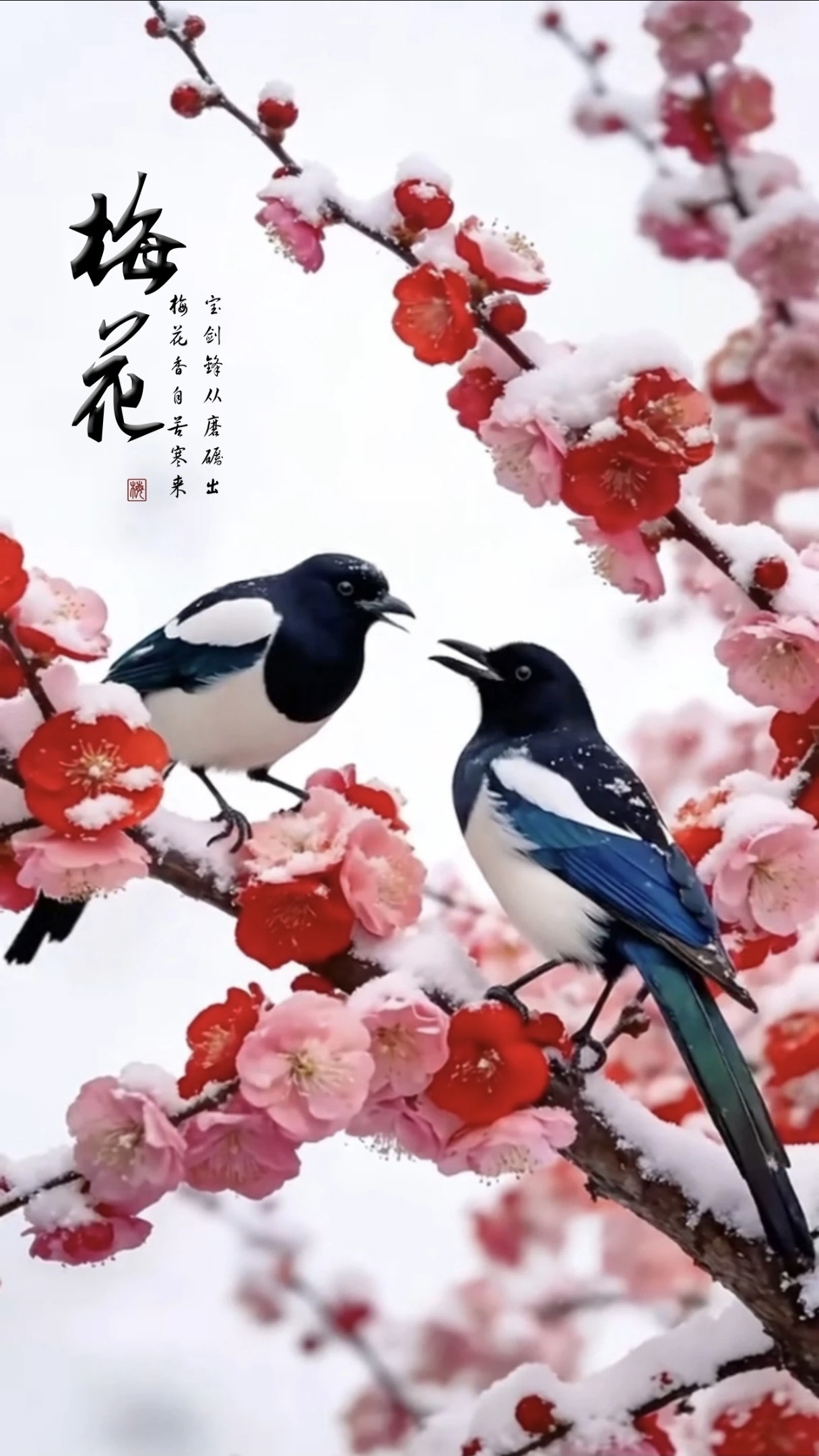 正琼枝缀锦,红梅破雪;玄裳映白,灵鹊凝眸。