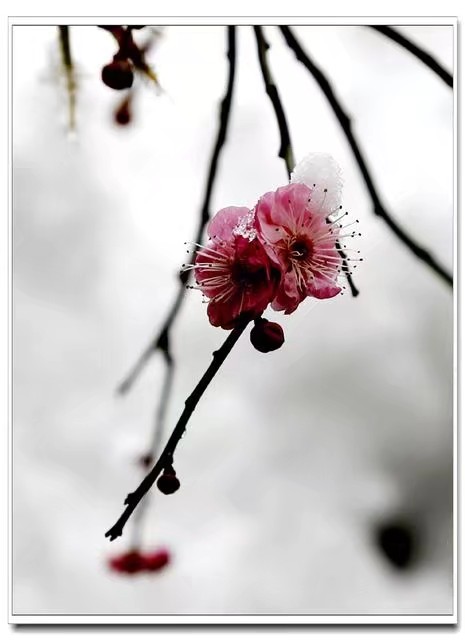 念奴娇•梅(新韵.苏轼体) 文/刘德瑞酷寒冬季,朔风烈、枝叶群芳零落。绿萼昂然,犹玉立、何惧风欺雨打。大雪纷飞,悬冰百丈,玉蕾仍勃发。梅花如雪,漫天飞美如画。郊外山野茫茫,看银装素裹,冰凌垂挂。傲雪喧妍,枝上俏、琼蕊飞红飘洒。瘦骨青柔,风霜任凛冽,倩姿萧飒。婵娟疏影,峭崖明月花下。
