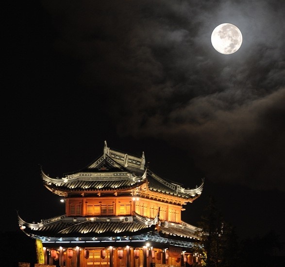 一轮圆月,从江面升起。幔帘拉起,月上柳梢头。火树银花不夜天,烟花腾空,响彻云霄。树林里栖息的鸟,瑟瑟发抖。人潮如织,歌舞升平,嫦娥、织女起舞弄清影,美好时光,适该一醉方休。