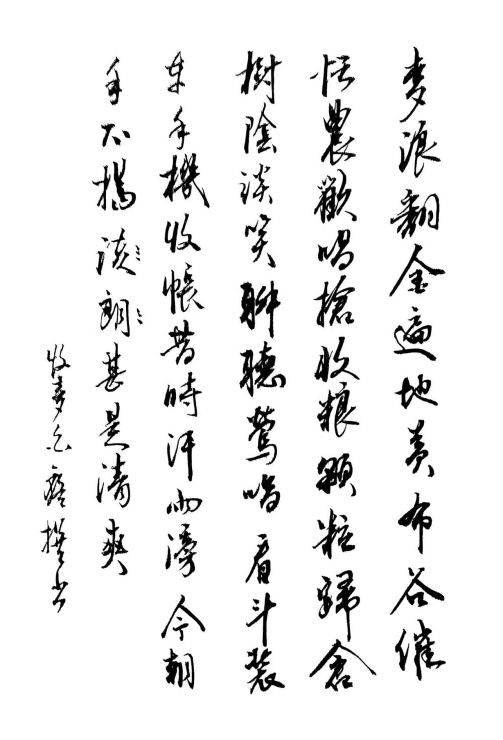 〔黄钟·刮地风〕收麦白泰山(湖北)铁马欢歌麦浪低,吞穗神奇,一川金海望无际。刀齿旋篦,往来驰电,麦收机内。扬臂装车,不遗余粒。笑看仓库里,粮山高耸起,该朗欢喜。〔黄钟·刮地风〕有两体,一式做套数,一式作小令。此为小令专用谱。谱:×仄平平仄厶平(上)△,×仄平平△。×平×仄仄平平△,×仄平平△。×平平去▲,×平平去△。×仄平平,×平平去△。×平×仄平(上)△,×平×仄平(上)△,×仄平平(上)△。