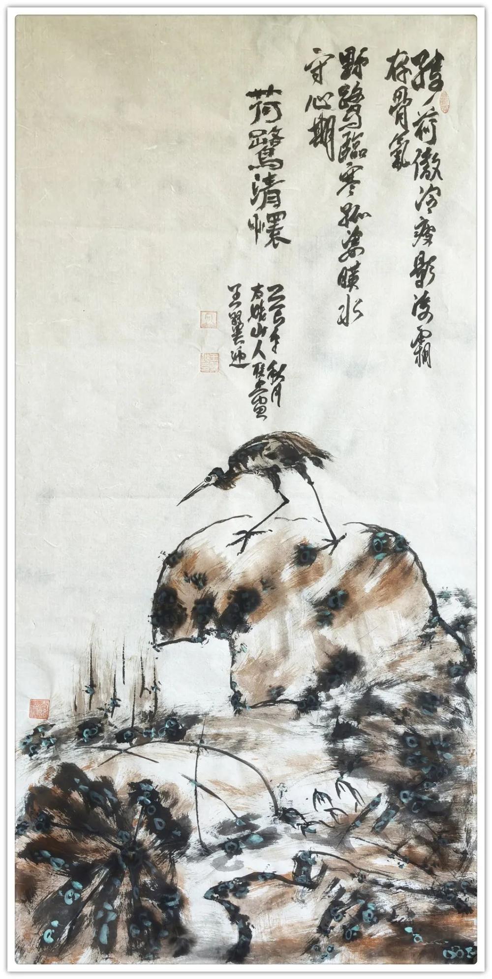 残荷傲冷,瘦影凌霜存骨气;野鹭临寒,孤姿映水守心期。