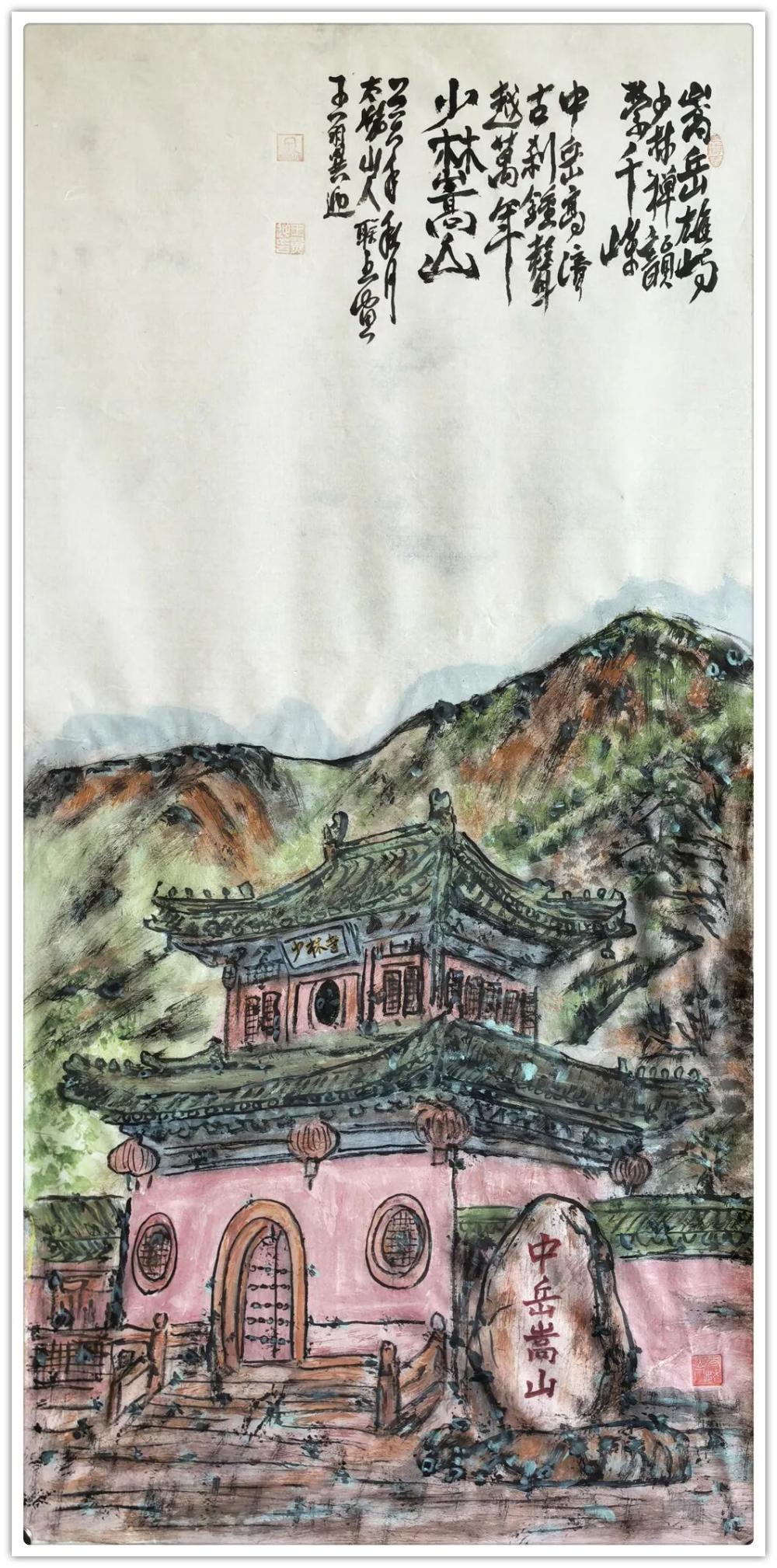嵩岳雄峙,少林禅韵萦千嶂;中峰高耸,古刹钟声越万年