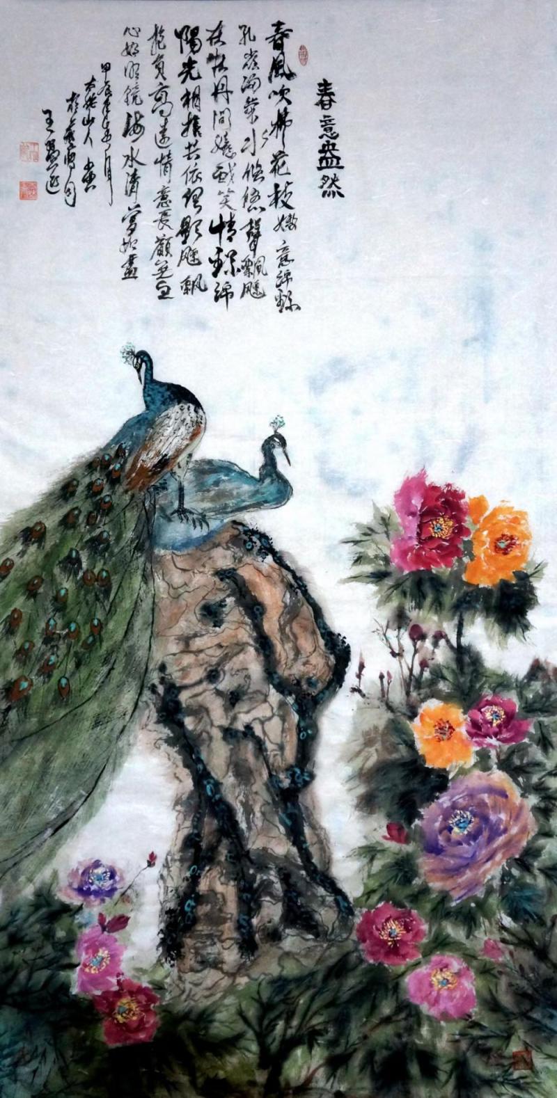 在牡丹间嬉戏笑,情绵绵;阳光相拥共依偎,影飘飘。