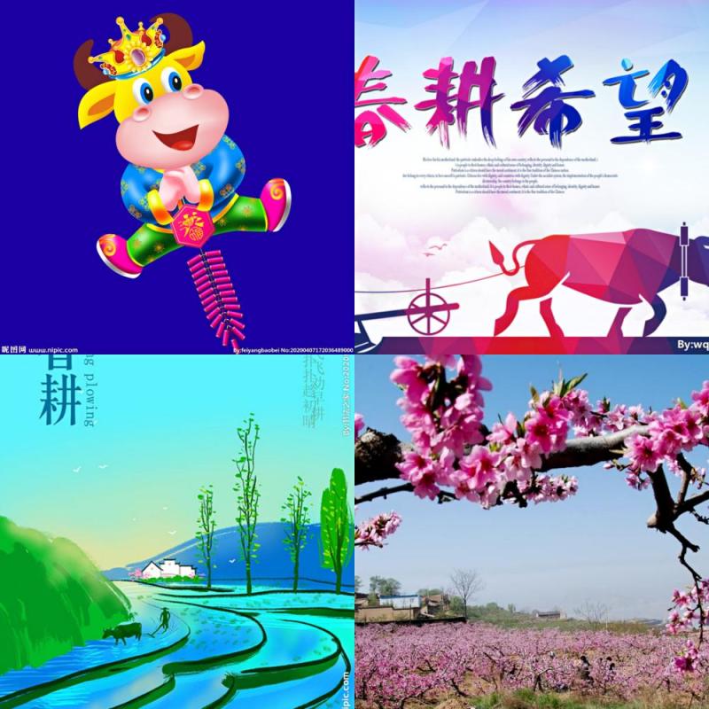 牛子耕耘奋力前,犁铧翻起九春妍。人面笑开红艳艳,桃花源赐醉春田。
