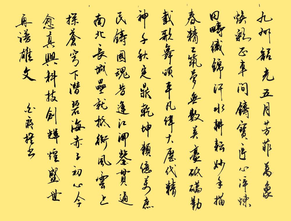 〔双调·大德歌〕赞劳动节白泰山(湖北)铁臂摇,战旌飘,汗雨飞扬宇宙小。妖娆风光好,钢花溅稼穑饶。人间盛世黎民造,全凭劳动者手底巧裁刀! 〔双调·大德歌〕小令兼用。第四句第二字暗韵与否均可。谱:××平△,仄平平△,×仄×平×厶平(上)△。×仄∧平平去△,×××、仄仄平△。×平×仄平平去△,×仄仄平平△。