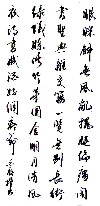 〔双调·殿前欢〕自画像白泰山(湖北)5:09 2025/2/3眼脒斜,无风乱摆腿偏瘸。闲书圣典杂交藉,一览无别。长街绿蚁赊,修竹团茅舍,明月清风夜。诗书赋酒,好个痴爷。〔双调·殿前欢〕小令兼用。又名小妇孩儿、凤将雏、燕引雏。第六可为平平厶△。也可六七两句同为平平厶△。谱:仄平平△,×平×仄仄平平△。×平×仄平平厶△,×仄平平△。平平仄仄平△,×仄平平厶△,×仄平平厶△。×平×仄,×仄平平△。
