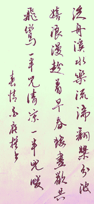 〔仙吕·一半儿〕春情白泰山(湖北)泛舟溪水乐流湍,翻桨分波嬉浪漫,趁着早春犹尽欢。共飞鸾,一半儿清凉一半儿暖。〔仙吕·一半儿〕小令兼用。谱:×平×仄仄平平△,×仄平平×去平(上)△,×仄×平平去平(上)△。厶平平△,一半儿平平一半儿上(平)△。