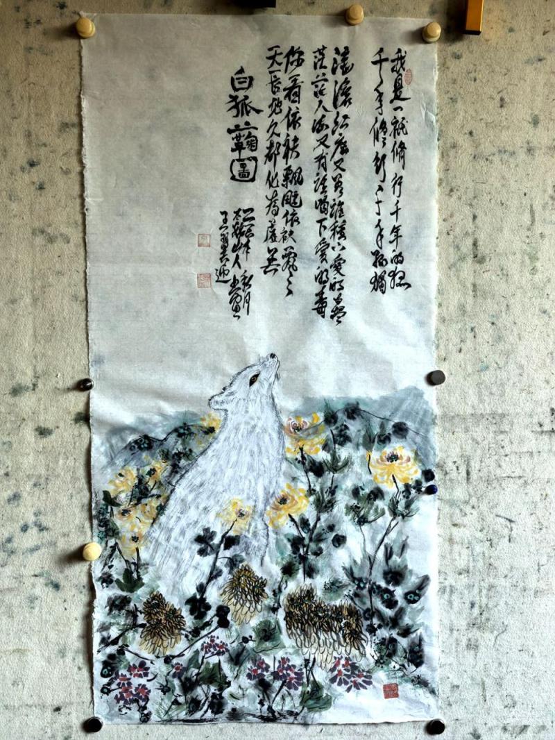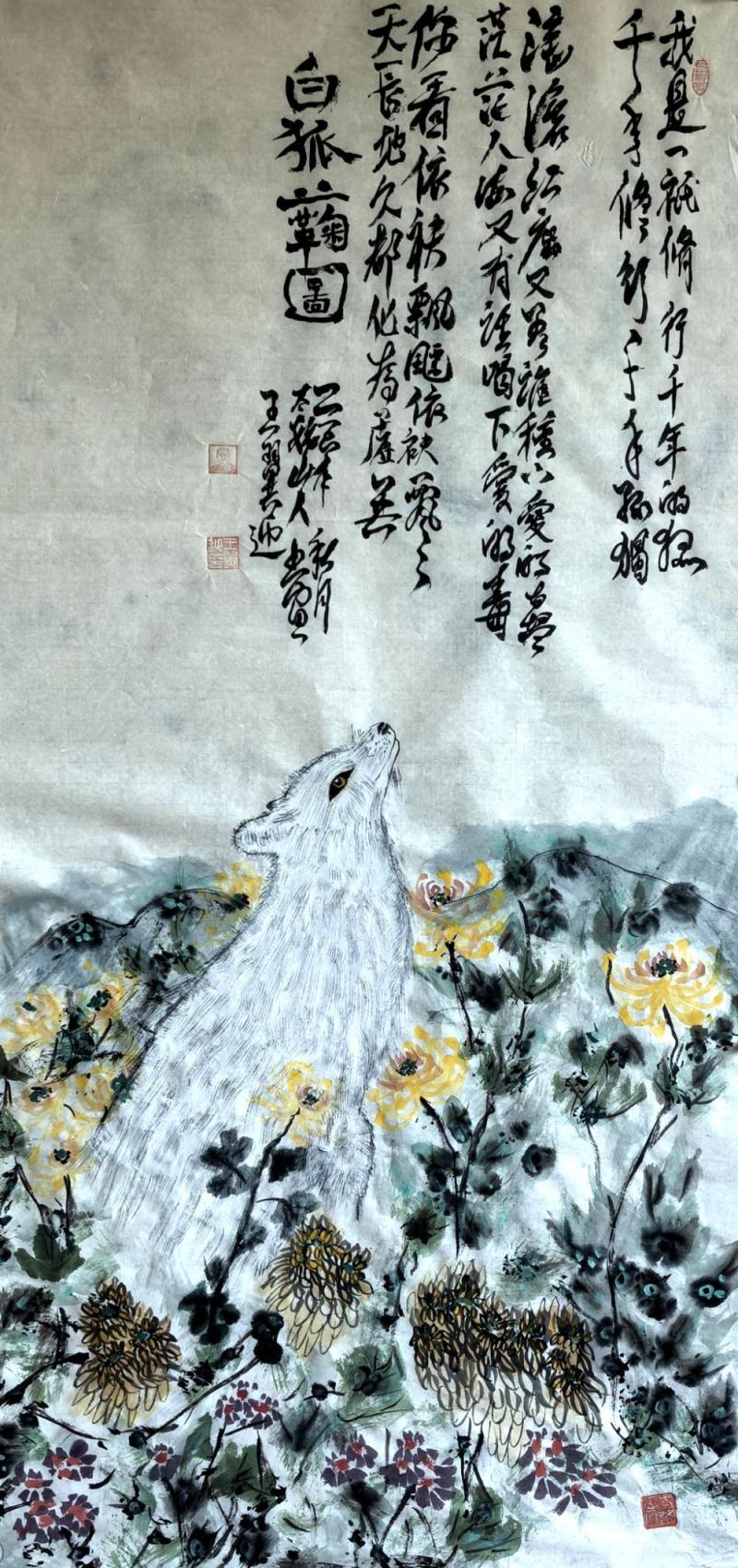 霜染秋丛玉色狐,寒潭照影意踟蹰。千年月落一声孤。 墨晕山岚迷旧径,金英冷蕊抱冰壶。西风不解鬓边朱。