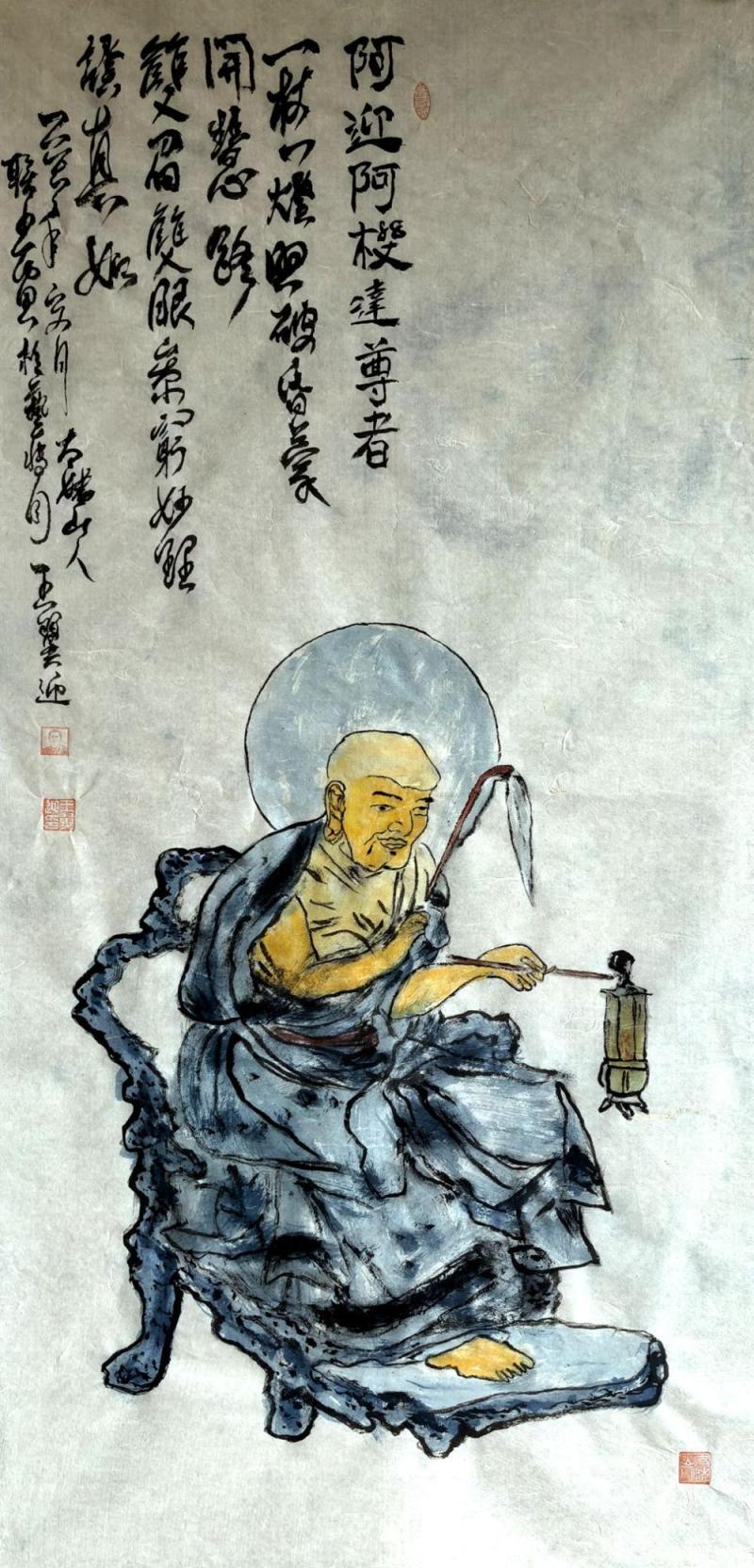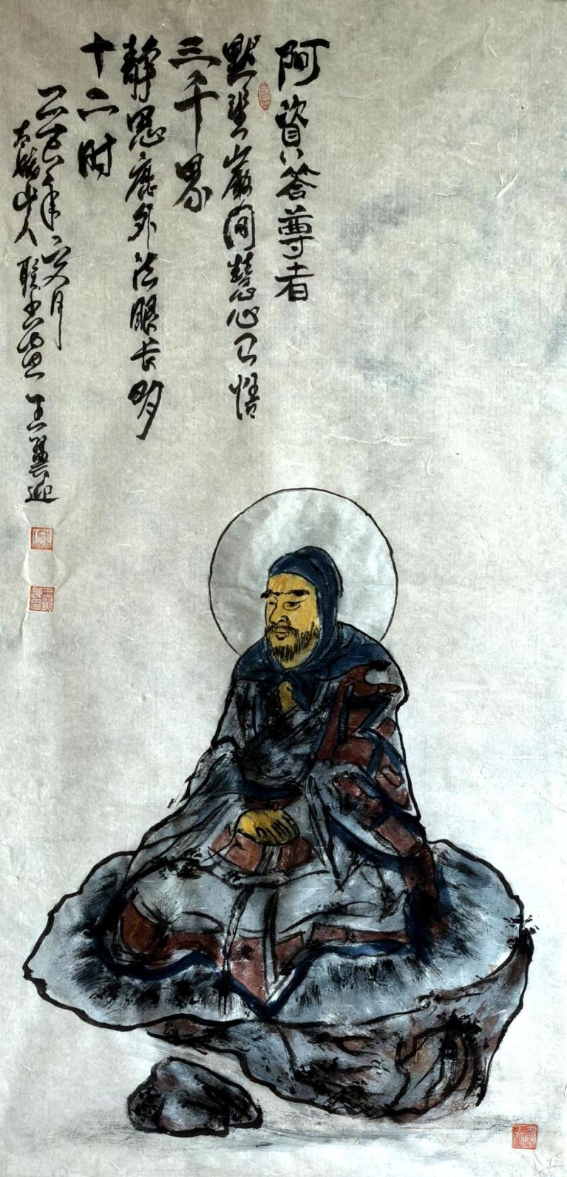 独坐苍岩烟霭里,杖头挑尽黄昏。衣纹褶皱刻年轮。眉攒尘世影,灯照本来心。拂去虚空千点妄,方知真供无文。青山不老伴禅身。松风传妙谛,冷月照归人。