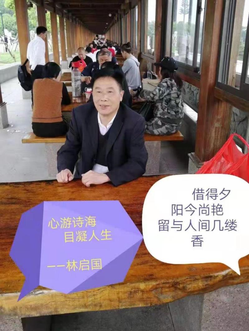林启国,男,生于1957年,湖北省黄冈市罗田县人,现住福建省厦门市湖里区,中共党员,大学物理本科学历,中学高级物理教师(已退休),认证诗人作家,《中原诗词研究会》骨干会员。本人喜欢诵诗吟赋,咏景抒情,丑恶伪谬词里砭,美善真理赋中吟。退休三年来,创作诗词近百余篇,有部分诗作在《厦门晚报》及其它报刊或诗刊上发表。在参加由中原诗词研究会和当代诗歌研究会等多家诗词机构联合主办的《中国民间诗人》诗词评选中,荣获“六大诗派”之一的“红诗派代表人物”称号。