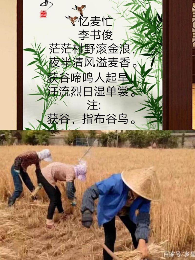 茫茫村野滚金浪,夜半清风溢麦香。获谷啼鸣人起早,汗流烈日湿单裳。