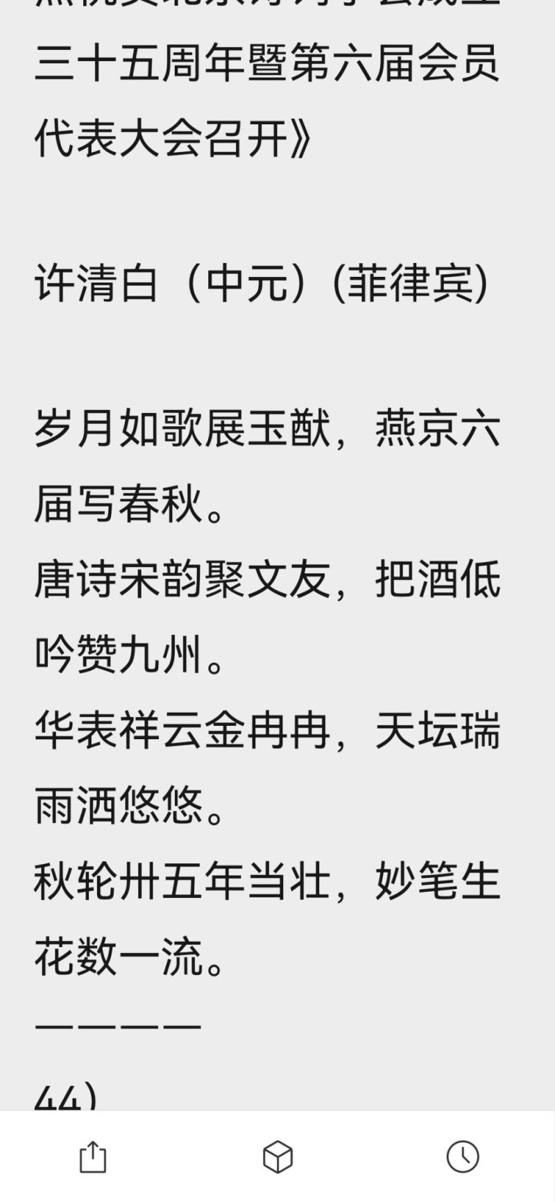 《熱烈祝賀北京詩詞學會成立三十五周年暨第六屆會員代表大會召開》文/中元(菲律賓)歲月如歌展玉猷,燕京六屆寫春秋。唐詩宋韻聚文友,把酒低吟讚九州。華表祥雲金冉冉,天壇瑞雨灑悠悠。秋輪卅五年當壯,妙筆生花數一流。