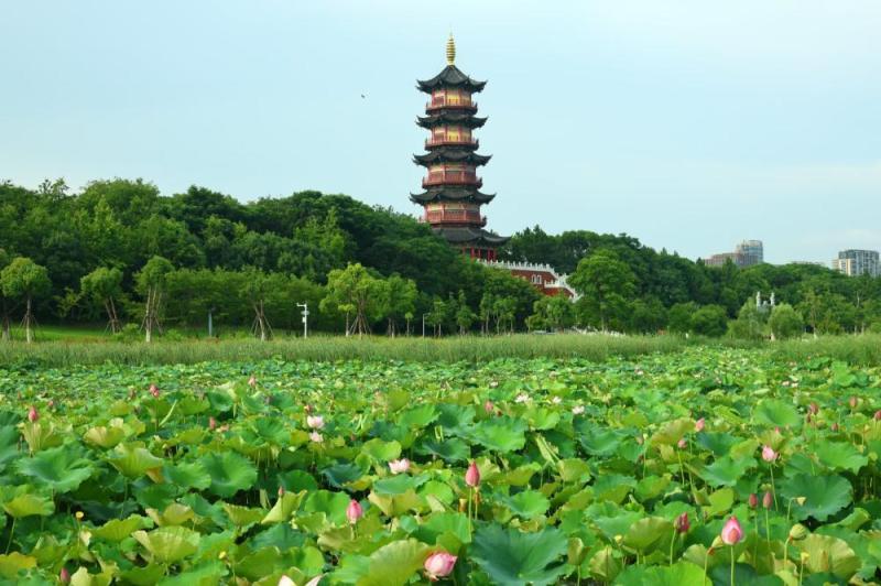 在象湖公园的柔波里踏入荷花盛开的天地阳光洒在美丽的荷塘湖面波光与荷影共舞