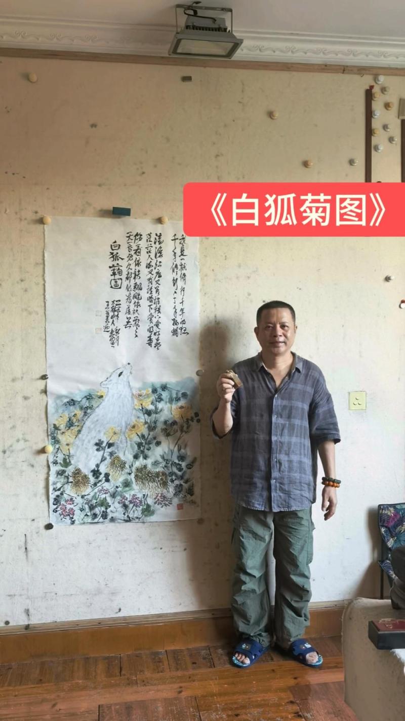 霜染秋丛玉色狐,寒潭照影意踟蹰。千年月落一声孤。 墨晕山岚迷旧径,金英冷蕊抱冰壶。西风不解鬓边朱。