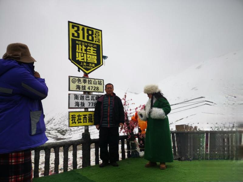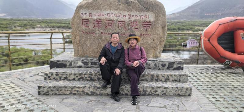 谁遗玉带嵌山阿,灼灼夭桃沿岸多。云岭经幡风共舞,清波起处是渔歌。