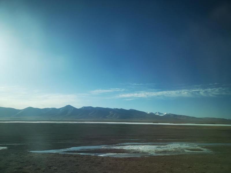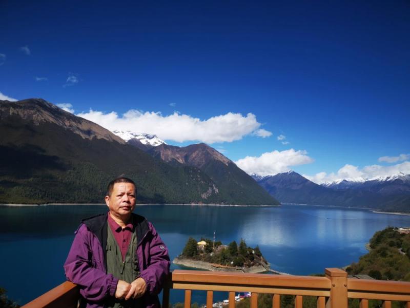 银龙越岭向天游,万里逍遥青藏悠。曾困铁鹰卅时滞,今乘专列三天流。六旬虽近身犹健,八法仍研意未休。最喜沿途皆入画,澄湖雪域豁吟眸。