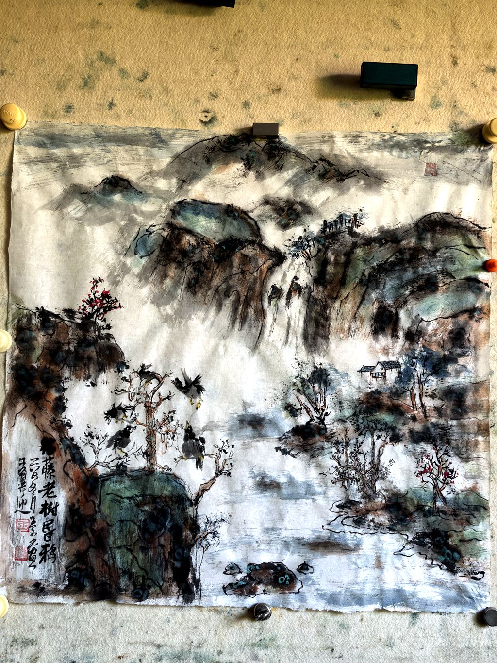 注释:1. 残霞:呼应诗句“映落霞”,贴合画作中黄昏霞光晕染的天色意境。 2. 烟岚:山间的雾气,再现画中水墨晕染的朦胧质感,凸显冬景的清幽。 3. 墨痕:代指画作的笔墨韵味,将赏画的感受与画面的艺术特色相融。 4. 忘岁华:抒发观画后沉浸于山林冬景,忘却尘世岁月的闲适心境。