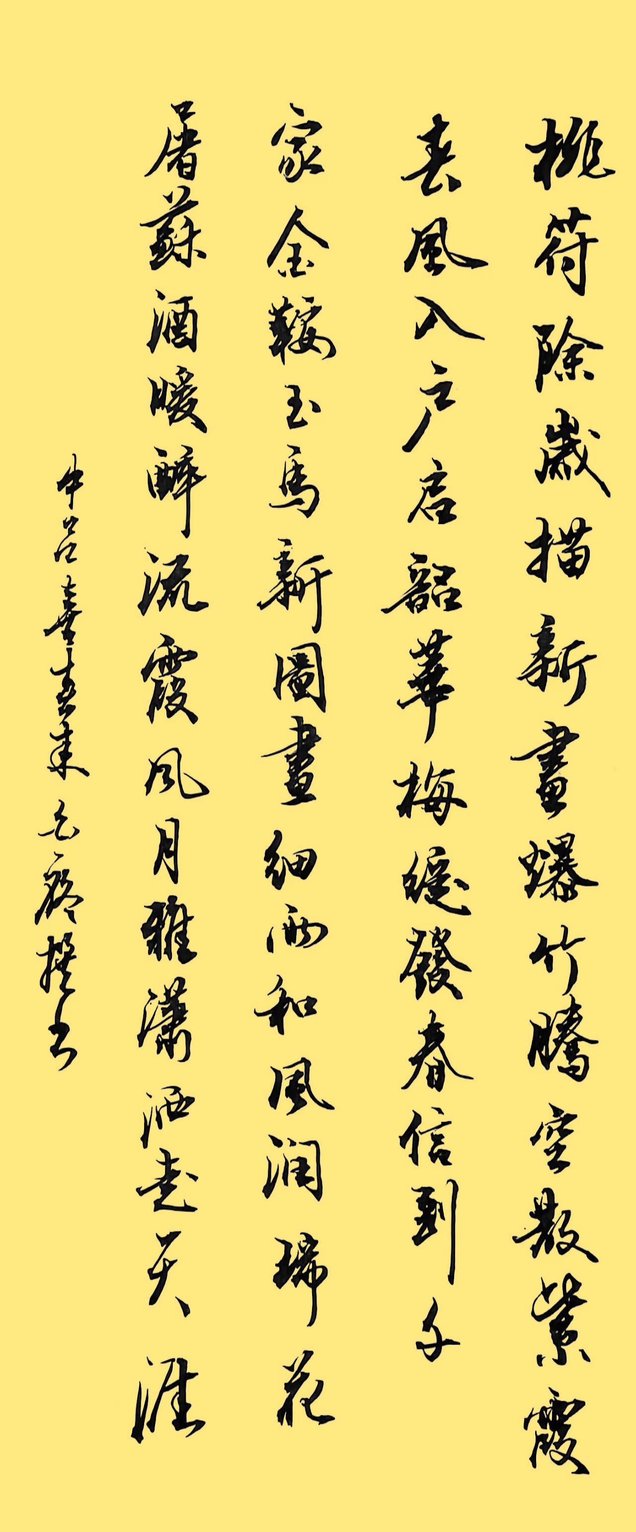 桃符除旧描新画,爆竹腾空散紫霞,东风入户启韶华。梅绽发,春信到千家。