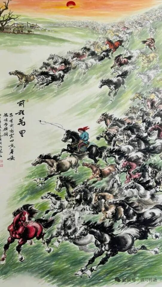 上阕:踏碎风云见神形,起笔三句“蹴裂寒云,踏破苍茫,声震天隅”,以爆裂式动词串接天地意象,如金石掷地,瞬间激活马的冲击力。“霜蹄掠野”与“金鬃灼夜”一昼一夜,一实一虚,形成时空张力。“电扫千峰,飙驰九域”则通过宏观地理的急速转换,强化了马超越物理界限的动能。结句“乾坤倒立,星月皆驹”更是神来之笔。以倒置的宇宙为背景,将星月幻化为奔马群像,在超现实意境中完成了对马之神性的最高礼赞。