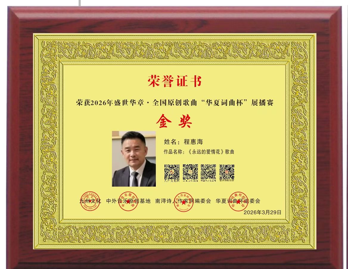 著名诗人简介:程惠海,字相儒,笔名,博文,男,1964年2月出生,中共党员,大学本科学历,山东省东明县人,教育家,书法艺术家,作家,词曲家,诗人,高级心理咨询师,中国诗人作家网认证金笔诗人,中国诗人作家网编委会终身会员,中华诗词学会会员,中国书画家协会会员,被中国艺术家职称评定委员会评定为:一级书法师,被全球华语文化著名组织中国燕京文化集团授予:终身编辑。官方认证当代书画家。央视官网认证中国书坛名家。曾任全国中等专业学校外语教学教研会理事,全国外语报社记者,美国海外艺术家协会理事,山东省师范教育学会理事,山西省《学习报》特邀编辑。现任知程书画院院长。独著和任主编、副主编出版的著作有《初级英语学习指导》、《中华教育与教学实践》、《教育教学研究》、《中学生思想品德修养》、《儿童心理与教育法》。1997年6月被国际文化出版公司特聘为《全国中小学优秀教改经验论文集》编委,连续出版五卷,达800多万字。在各报刊发表论文有:《浅析英汉两种语言的异同》、《浅谈中专英语语法总复习》、《论外语教学研究与实践》、《加强师资队伍建设,促进素质教育发展》等30余篇。在2022年翰墨百“神州韵律杯”全国原创诗词大赛中,作品荣获优秀奖。在《中国诗人辞典》暨第五届“孔子诗歌杯”全球诗人作家创作大奖赛获新锐诗人奖。在各大网站诗词刊物发表的代表作品有:《春天》、《心境》、《悟道》、《感言》、《知足常乐》、《岁月虽老•心向暖阳》、《永远的爱情花》等300多首。其卓越成就已被收入《中国当代知名学者辞典》、《中国当代著作家大辞典》、《世界名人录》、《华夏诗词》、《华夏诗歌》、《中国诗人辞典》等。在2024年度“中华诗.金蝉奖”中,荣获特别优秀诗人奖。在2025 年全球华语文豪之巅“中华星光杯”文化传承文学赛中,荣获季军。在2025首届“屈原杯”世界华语国学经典文学赛中,荣获冠军。在2026马上封侯全球华人文艺大赛中,荣获特等奖。在2026年盛世华章•全国原创歌曲【华夏词曲杯】展播赛中,荣获金奖。在中国鲁迅杯全国首届华语文艺精英大赛中,荣获鲁迅金杯奖。在第二十四届华夏兰亭杯全国书法大赛中,荣获冠军。