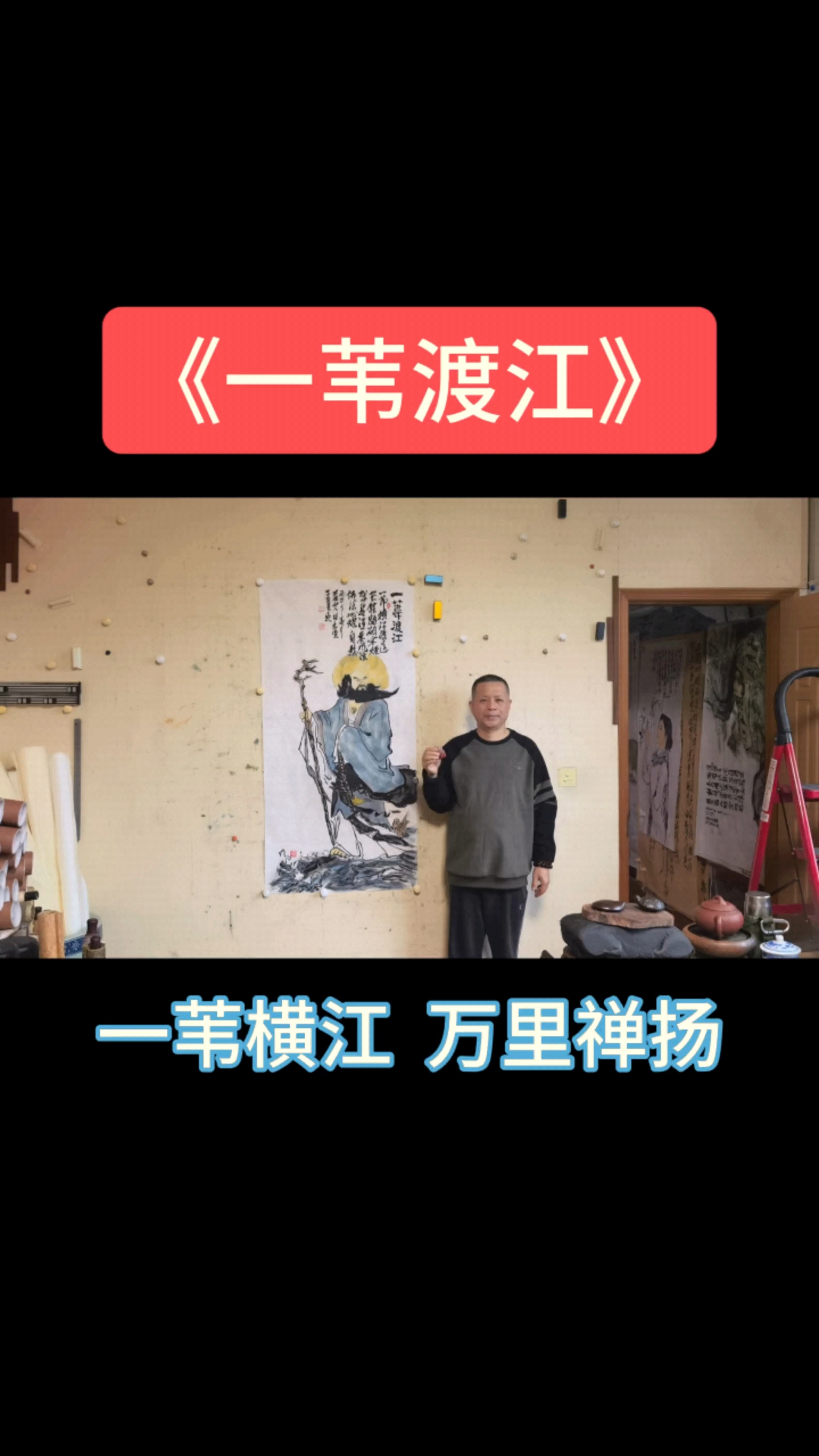 注释:◎一苇横江:典出达摩祖师“一苇渡江”,以一叶芦苇为舟,横渡长江,喻佛法弘传之不易与禅者的自在无碍。◎ 芒鞋踏破:指行者云游四方、历尽艰辛,以求得道。◎ 袈裟漫卷:写江风猎猎,衣袂飞扬,尽显高僧风骨。◎ 心灯自悬:以心为灯,照亮前路,暗喻佛法智慧不灭,自度度人。