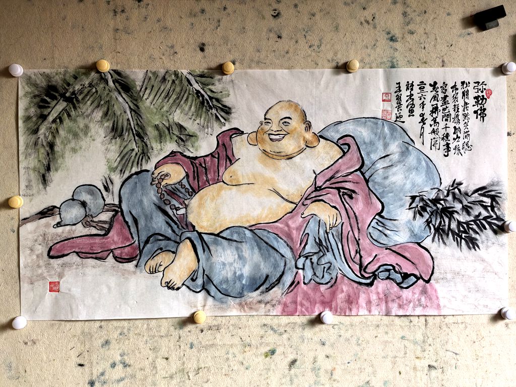 袒腹拈珠笑满腮,布袋轻携纳九垓。容尽世间千种事,春风一拂万般开。