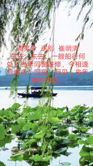 杨柳送风情,花儿列队迎。艳阳呈笑脸,雨点滴苗生。湖水扬波滟,山川挥手行。吾心随意唱,国泰众人宁。