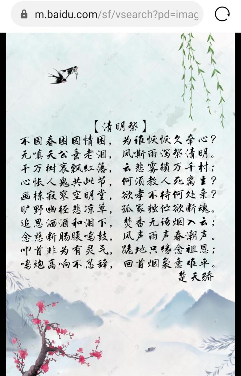 【清明祭】不因春困因情困,为谁恹恹久牵心?无嗔天公垂老泪,风嘶雨泻祭清明。干万树哀飘红落,云悲雾锁万千村;心怅人鬼共此节,何须教人死离生?画栋寂寥空明堂,欲孝不待何处亲?旷野幽径悲凉草,孤冢独伫欲断魂。追思洒酒和泪下,焚香无语烟入云;念慈断肠腹鸣鼓,风声雨声春潮声。叩首非为有灵气,跪地只缘念祖恩;鸣炮高响不忍辞,回首烟袅意难平。 楚天骄
