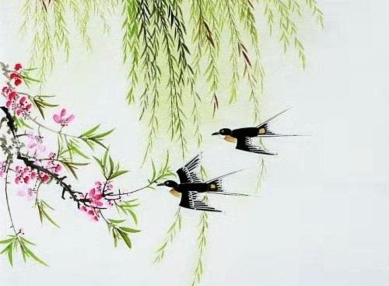 春满人间,杨柳堆烟。屋檐下、紫燕翩跹。梅花院落,放眼风鸢。稚童遥指,翠湖影,水中天。