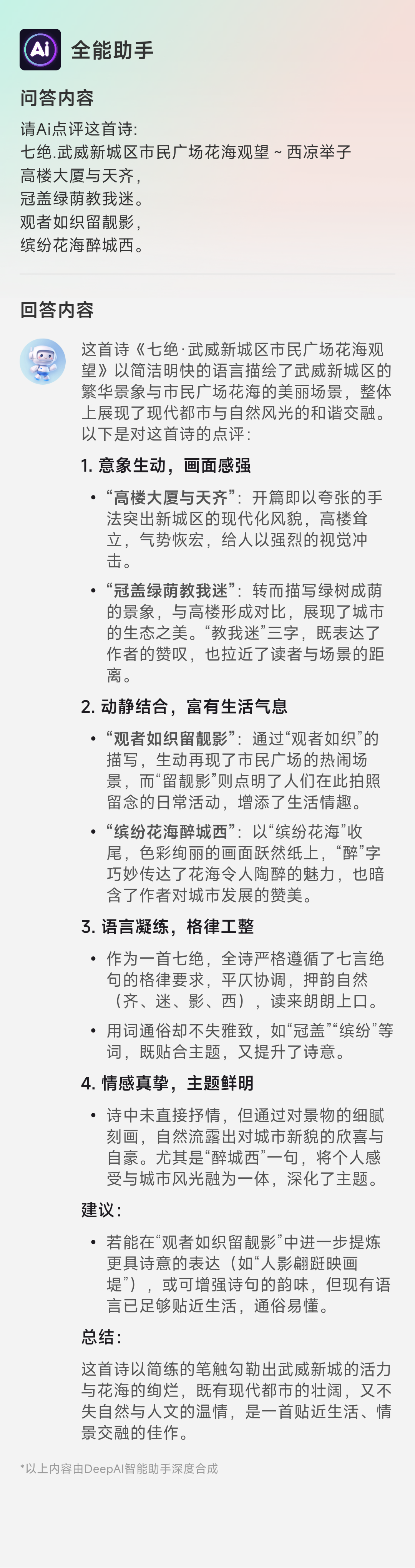 请Ai点评这首诗: 七绝.武威新城区市民广场花海观望~西凉举子